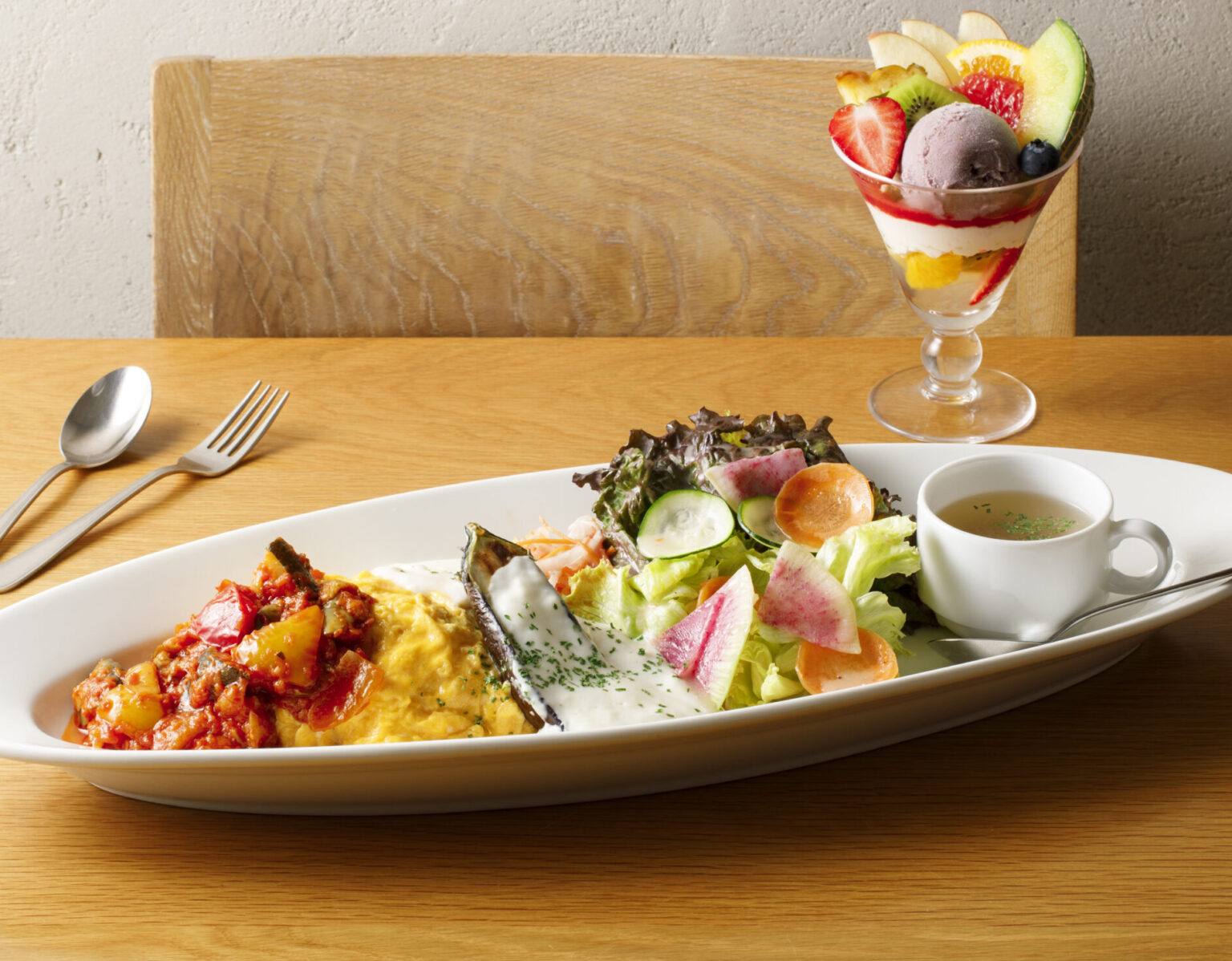 【八百屋さんのオムライス~ラタトゥイユとホワイトソース仕立て~(スープ付き)&パフェセット 」2,260円(税込)
