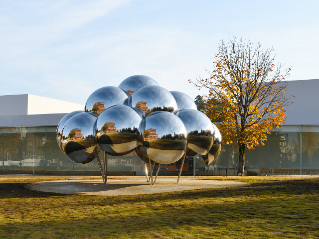 写真は、2016年から設置されたSANAAによる球体パビリオン「まる」。早くも人気になっているこの作品は外側からも、内側からも鑑賞できる構造になっている。ぜひ現地で楽しんでほしい作品だ。