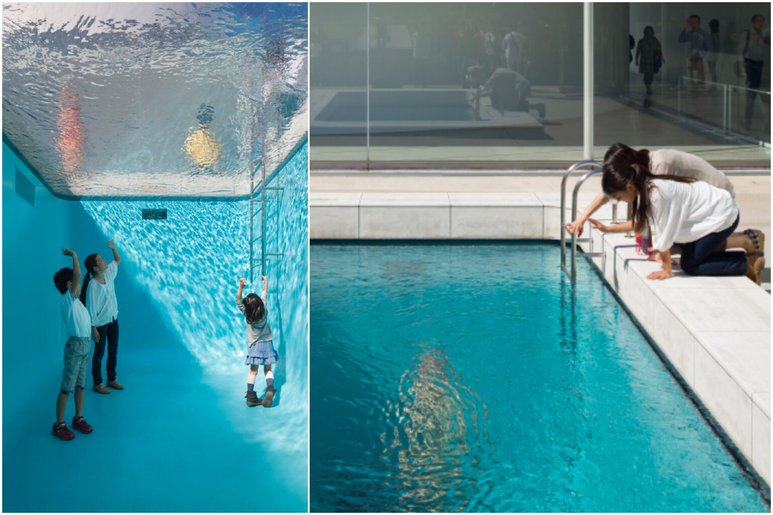 上側(交流ゾーン)からはプールの底をのぞきこみたくなり、下側(展覧会ゾーン)に降りれば上にいる人を見上げたくなる非日常的な光景にテンションが上がり、だれもがカメラのシャッターを押してしまうだろう。