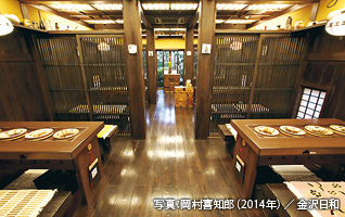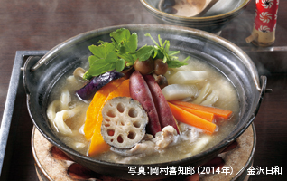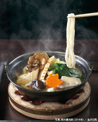 小坂れんこんのすり流しとたっぷりの根菜が入った「加賀れんこんすり流し饂飩鍋」や自家製味噌で楽しむ「味噌牡蠣饂飩鍋」、金沢らしい「治部煮饂飩鍋」― 地物が充実する冬場はいっそう魅力的なメニューが揃う。鍋にかけている間にしっかり出汁と素材の旨味がうどんに沁み、食べ進むほどに夢中になる。