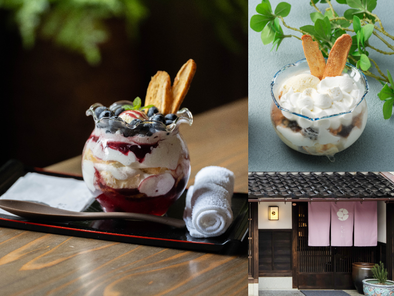 東山の古民家カフェで、清涼感のあるフルーツパフェはいかが。