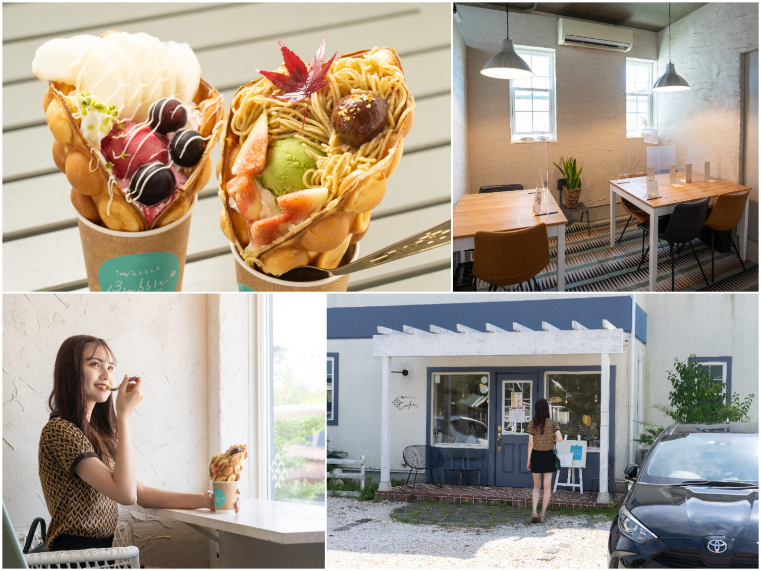 内灘町の住宅街に佇むワッフル専門店。ベルギーワッフル、香港のエッグワッフル、アメリカンワッフル、オランダのストロープワッフルの世界4大ワッフルに出合えます。イチオシは海外でも話題沸騰中のエッグワッフル。「能登栗モンブランマスカルポーネ無花果バブル」は秋の限定品だそう。マスカルポーネ入りの自家製生クリームとアイス、能登栗ペースト、無花果が贅沢にトッピングされていてテンションがアップ! タピオカ粉入りのエッグワッフル生地は外がカリカリ、中がモチモチの食感がたまらない新感覚スイーツです。