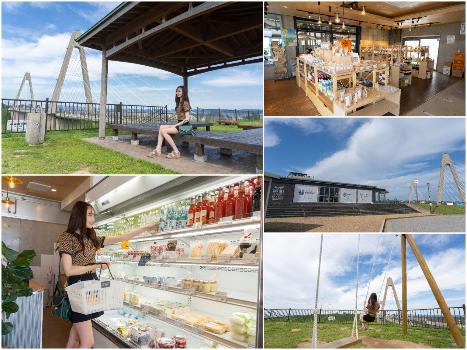 2022年7月にリニューアルした『道の駅 内灘サンセットパーク』は、内灘町のシンボル・サンセットブリッジのすぐそばにあり、白山や立山が見渡せる最高のロケーション。施設内の物販スペース『OTAKARA MARKET』では、牧場のミルクを使ったアイスやプリンなどの内灘町の特産品のほか、石川県内の生産者のこだわりが光る逸品グルメ、オリジナル商品など300種類がセレクトされ、欲しいものがいっぱい。屋外には海を眺めながら遊べる「展望ブランコ」も! 思い切り漕げば、まるで空を飛んでいるような爽快な気分になれます。