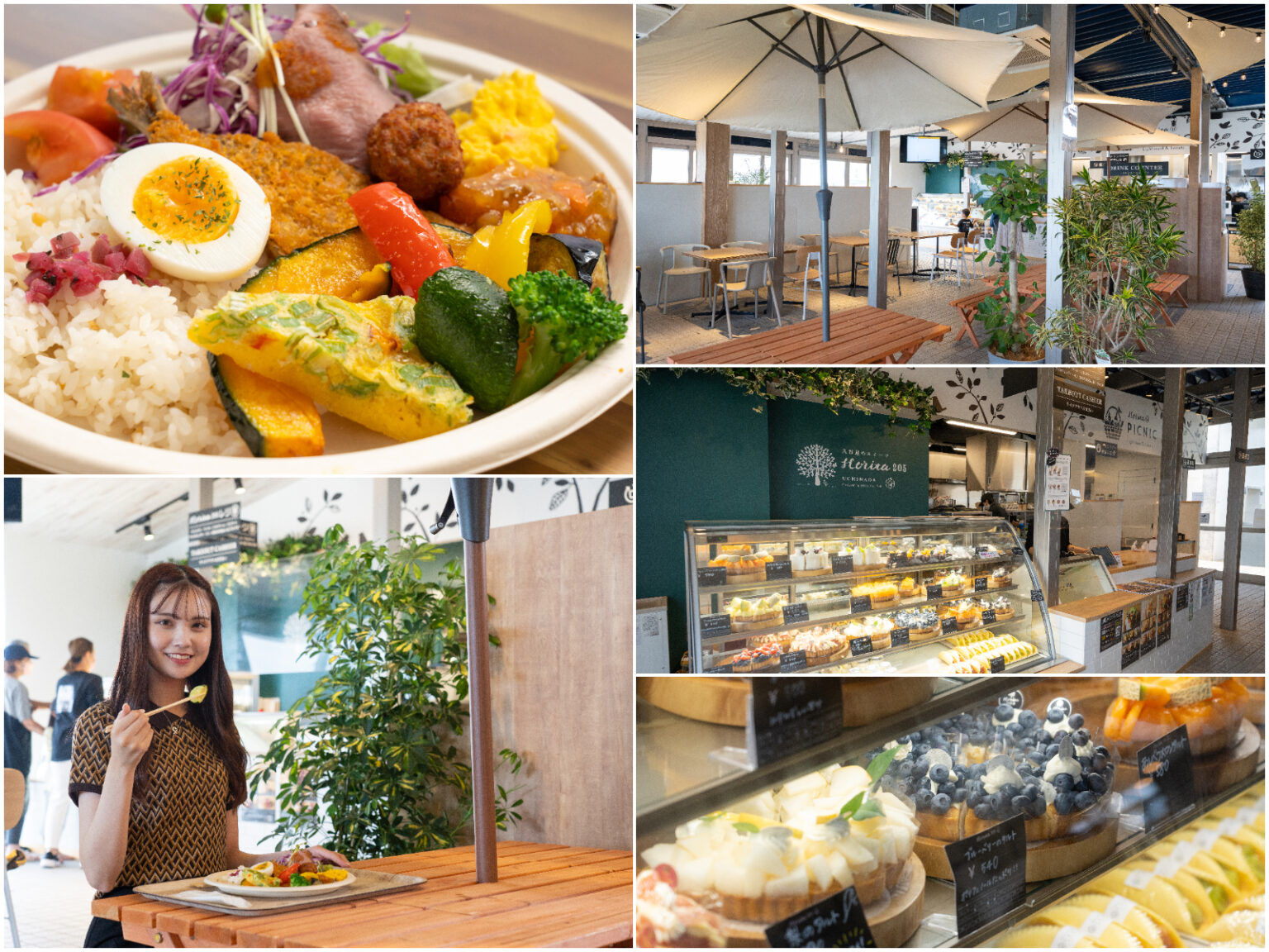 道の駅内には金沢の老舗八百屋『堀他』が展開する『Horita PICNIC』も同時オープン。カジュアルな空間で軽食とスイーツをいただけます。メニューは券売機でのオーダー後、モニターでできあがりを確認してカウンターで受け取るセルフスタイル。たっぷりの新鮮な野菜に魚のフライを盛り付けた、彩り鮮やかなデリランチに大満足♡ 併設の『Horita 205 UCHINADA』ではフレッシュフルーツのケーキをはじめ、ハーモニーウィズの生乳を使用したソフトクリーム、お弁当などのテイクアウト商品を販売しているので、お土産に購入しても♪