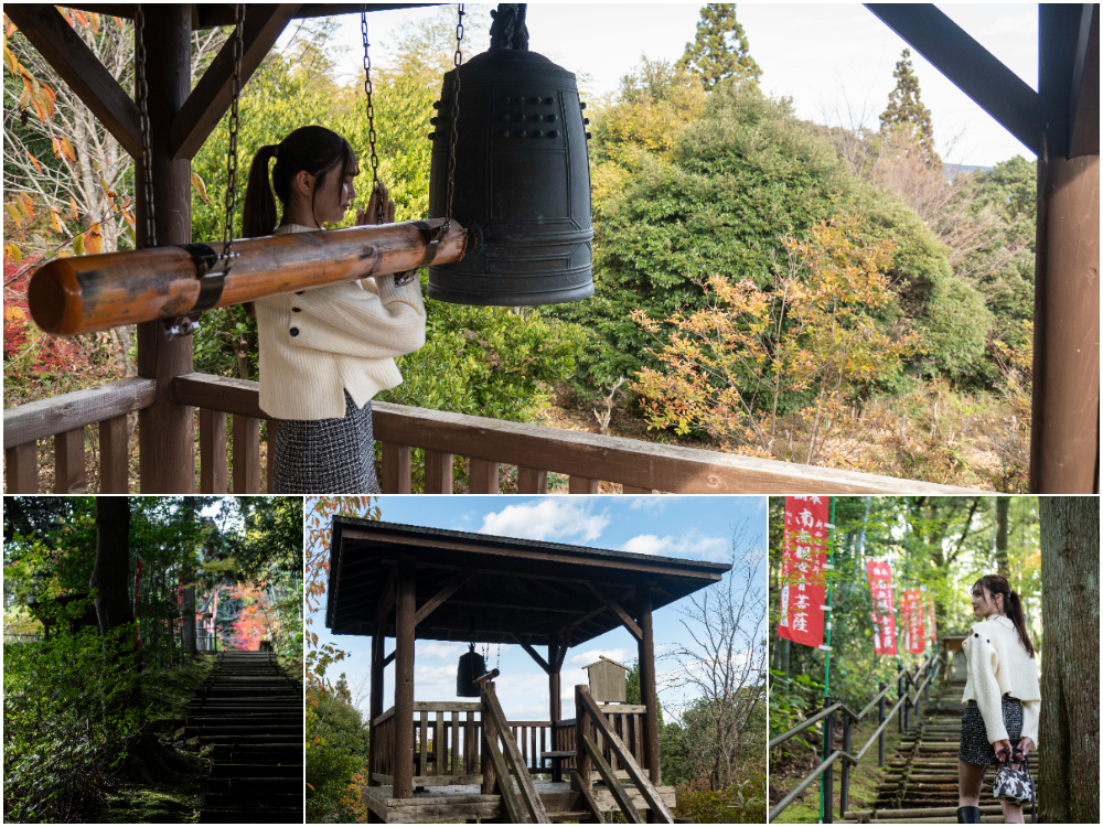 開けた高台には「和みの鐘」が設置され、遠く七尾湾や能登島大橋まで見渡せる絶景が広がっていました。“想いを込めて3回鐘を撞くと願いが叶うかも”とのことで、しっかりと願掛け♪ 撮影時が丁度紅葉シーズンの走りだったこともあり、階段には真っ赤に色づいた紅葉やまん丸のどんぐりが落ちていていました。季節ごとに新鮮な気分で散策が楽しめそうですね。