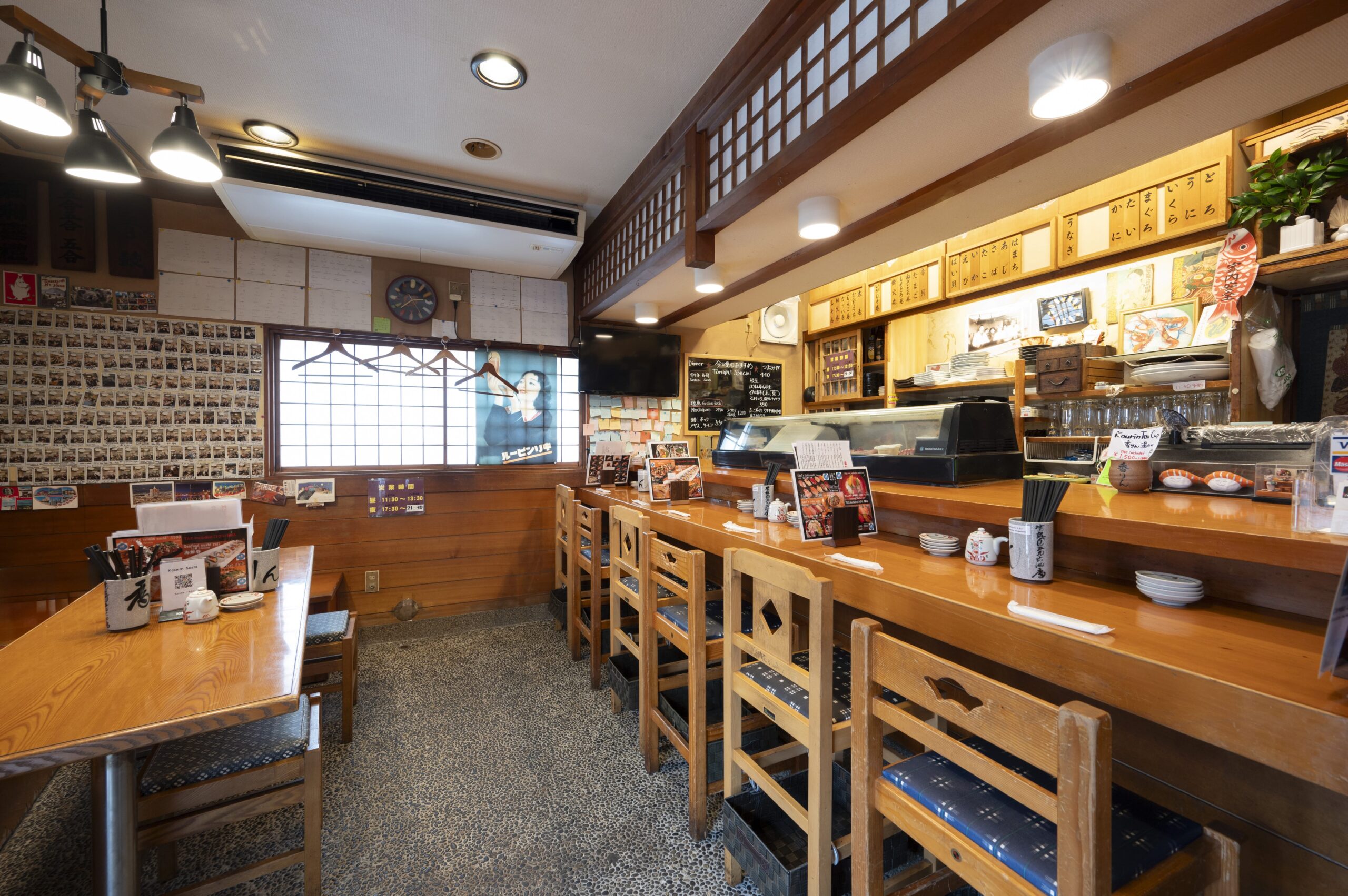 1951(昭和26)年の創業以来、親子四代にわたって受け継いできた寿司店。現在は三代目と四代目が切り盛りする。地元の常連客はもちろん、海外の旅行者向けサイトの高評価をきっかけに増えた外国人観光客からも大人気で、壁には世界中から訪れた客からのメッセージが貼られている。