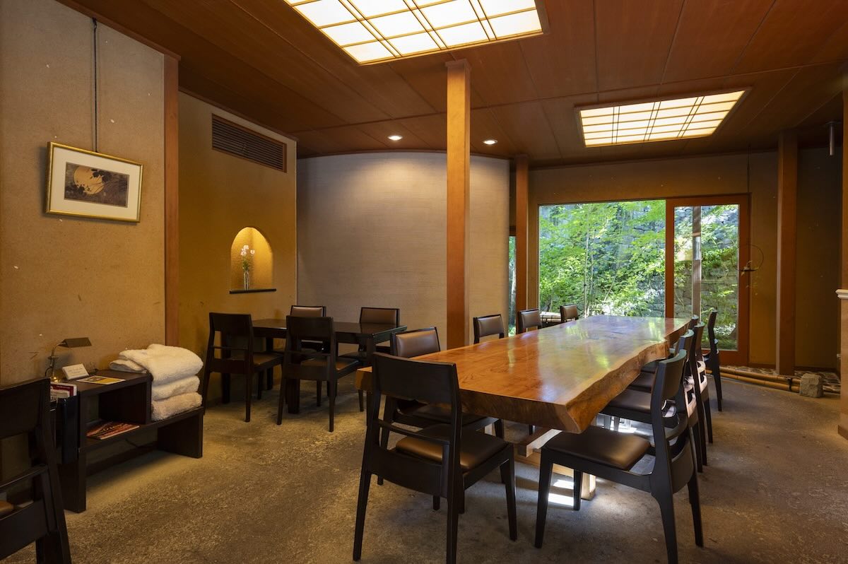 金沢の名職人たちが手掛けた店内は、洗練されていながらもくつろげる雰囲気。中央にはどっしりとした秋田杉の一枚板のテーブル、奥には金沢城の石垣を借景にした坪庭が配され、辰巳用水の瀬音に耳を傾けながら、四季折々の眺めが楽しめる。
