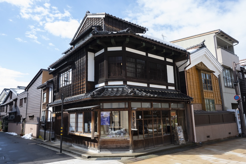 観光地・ひがし茶屋街の一角にある東山茶屋街店は、築80年以上の町家を改装した趣のある外観が目印。1階が販売店、2階は甘味処「和味」となっており、ここでしか味わえない菓子やスイーツが充実している。「和味」で提供するスイーツにはいずれも石川県の能登大納言小豆を使用。その形や色の鮮やかさから「赤い宝石」とも称される極上の小豆で、ふんだんに使用したチーズケーキや、とら豆・ひよこ豆・うぐいす豆・胡桃を贅沢にのせたタルトなどが人気だ。また、「和味」限定の能登大納言きんつばも提供されている。昭和初期の町家建築と、風情あるひがし茶屋街の景観を眺めながら、ゆったりとしたティータイムを楽しんでみてはいかがだろう。