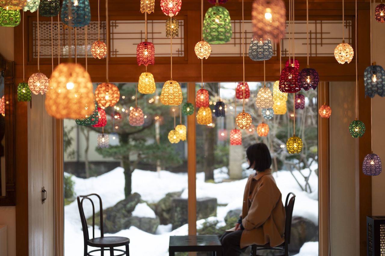 館内には、オリジナル水引「四季の糸」全200色で制作したランプシェードを展示。水引の色に合わせてデザインが異なっており、絶妙に配置されたランプシェードが幻想的な空間を演出している。なお、来館者がゆっくりと空間を楽しめるよう、一度に入館できる人数を制限しており、10人前後の入れ替え制を取っている。また、夏場には涼しげな水引風鈴がお目見え。フォトジェニックな空間のため、着物や浴衣で来館したり、"推し色"を探し出してアクスタと撮影を楽しんだりと、思い思いの楽しみ方をしている人が多いそう。金沢観光の思い出の1枚を撮影したい方におすすめのスポットだ。