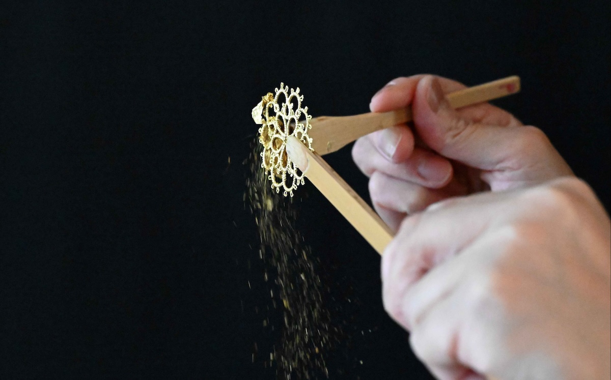 繊細なレースに金箔を重ねた金沢発のアクセサリーブランド「Gold‐Knot(ゴールドノット)」。作家の木和田里美さんは、金属アレルギーの自分でも身に付けられるアクセサリーを模索していた際、ヨーロッパ発祥のタティングレースの技法に着目。レースの型崩れを防ぐためにたどり着いたのがアレルギー反応を起こしにくい金箔だった。そこで、金沢が誇る伝統工芸品「金沢箔」を絹糸のレースに何層も重ね貼りする独自技法(特許取得)を開発。1年以上の試行錯誤を経て完成した。