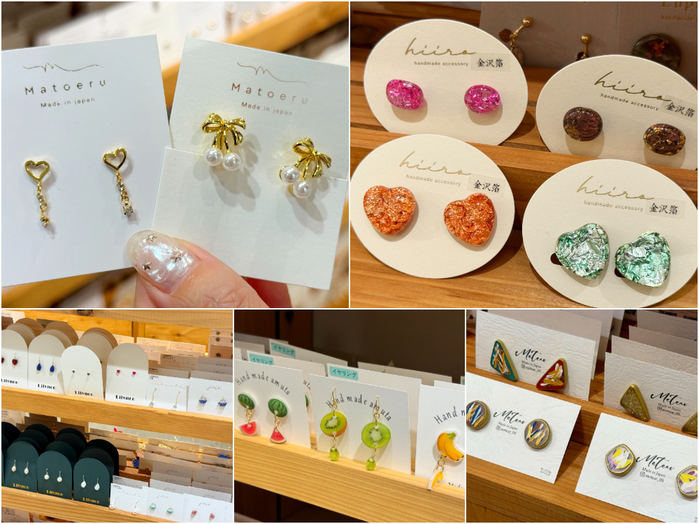 店舗オリジナルのアクセサリーは、シンプルだけど他と被らないデザインが光る。金沢らしい金箔を使ったものや、ハンドメイド作家による一点ものなど個性豊かで、ピアスはアレルギー対応素材を使用。イヤリングやリング、ネックレスまで100種類以上がそろい、日常使いにもお出かけにもぴったり。
