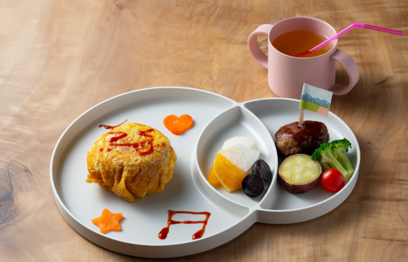 白山を一望できる抜群のロケーションに佇む、親子にやさしいカフェ。大きな窓の向こうに木場潟と田畑の穏やかな景色が広がり、日当たりのよい店内にはキッズスペース併設の小上がりを完備。バウンサーやバンボ、おもちゃ、ベビーベッド、角を丸くしたテーブルや割れない食器など、細やかな配慮が行き届いている。