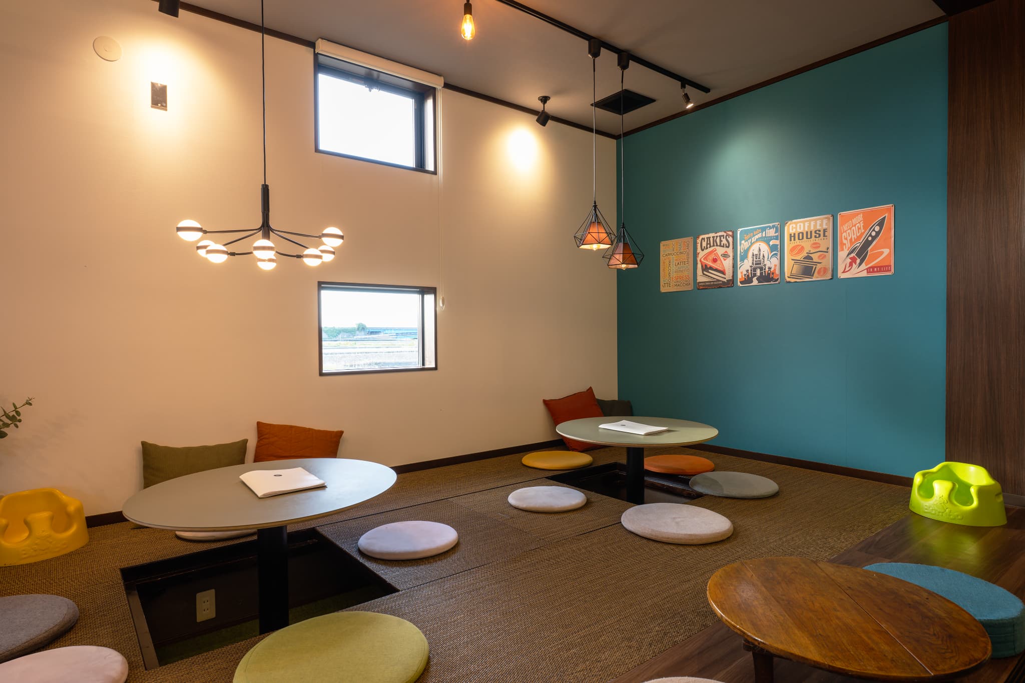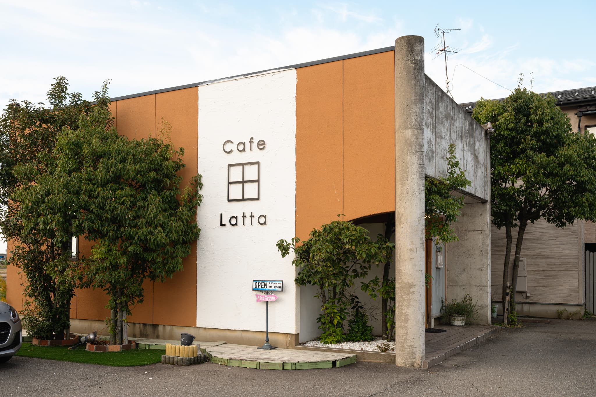 田んぼの先に空が大きく広がる国道8号線沿いに佇む『Cafe Latta』。店内はカウンター席をはじめ、小上がりのある丸テーブル、ソファ席、離れ個室まで揃い、子ども連れでもゆったりと過ごせる。
