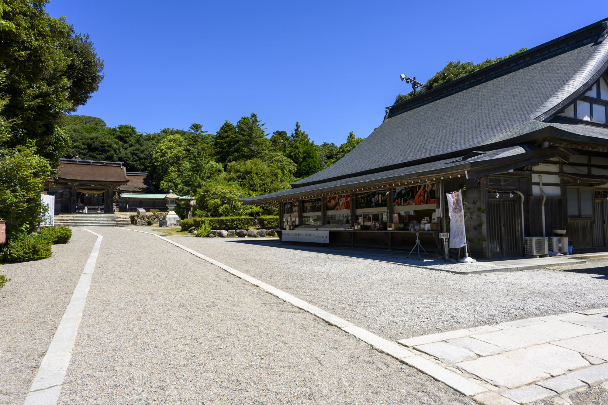 能登國一宮として古くから崇敬を集める社。海へ向かって伸びる参道の軸線をたどると、拝殿の奥には人の立ち入りを禁じた国指定天然記念物「入らずの森」が広がり、杜の気配が境内の空気を引き締める。御祭神は大己貴命(おおなむちのみこと 通称:大国主命)。縁結びや夫婦円満の祈りに訪れる人も多く、授与所には縁結び守などが揃う。
