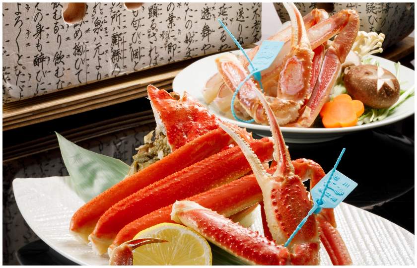 夕食は会席またはビュッフェで、のどぐろや寒ブリなど北陸の旬を用意。冬は加能ガニ(雄)や香箱ガニ(雌)が最盛期。「活加能蟹づくし会席」や「夫婦蟹(加能+香箱)会席」など、多彩な蟹プランが登場する(内容・価格は時期・プランにより変動)。