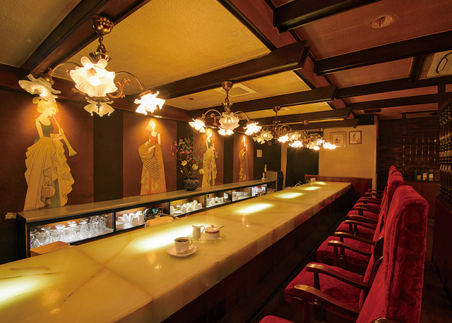 金沢の中心街から野々市市方面へ向う途中に位置している有松に店を構え、地域の常連はもちろん買い物帰りの人々など、幅広い世代の憩いの場として支持されている。艶やかな女性が描かれた壁画に装飾的なタイルの壁、花をモチーフにした照明やバラが描かれたエッチングガラス、モダンなステンドグラスなどがそこかしこにあしらわれ、落ち着きの中にも華やかさを感じる雰囲気が漂っている。客同士の間合いにも配慮された空間作りがされており、じっくりと寛ぐことができるのも魅力。濃厚な自家製のプリンや分厚い小倉トースト、具だくさんのホットサンドなどのメニューを求めて訪れる客も少なくない。カップにたっぷりと注がれたコーヒーも嬉しい限り。約40年続いているこの店には、オーナーの想いが凝縮されている。