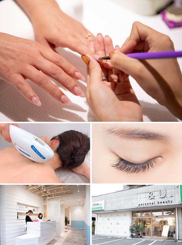 金沢市もりの里にオープンした『&U』は、脱毛、ハンドトリートメントエステ、まつ毛エクステ、ネイルの4ジャンルを組み合わせ、一人ひとりの顧客のビューティを提案するサロン。それぞれの分野に有資格のスタッフが在籍し、店内15ブースでパーソナルな施術をしてくれる。脱毛とネイルは男性もOKなので、カップルで行き、女性がネイルをしている間に、男性が脱毛をする、という組み合わせもできる。グループ会社にネイル、エステ、美容院があり、新店だがスタッフはベテラン揃いだ。