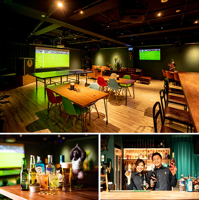 密林を思わせるエントランスや南国を感じさせる内観など非日常を楽しめる同店。店内は広々としており、大型のプロジェクターや照明、音響、DJブースなど、様々な設備もバッチリ揃っている。また同店ではコイン制の精算となっており、ドリンクをコインと交換するという遊び心のあるシステムとなっている。予約があればパーティー料理を提供することも可能。スポーツ観戦や結婚式の2次会など様々なシーンで使用することができる。