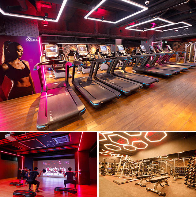 『イクスジム』には、ビギナーから本格アスリートまで幅広く対応した最新のトレーニングマシンが導入され、一人ひとりの目的や目標に合わせて使用できる。また、男性メンバー用にはタンニングマシン(日焼けマシン)も用意されている。1階のバーチャルスタジオでは、世界的フィットネス開発会社「レスミルズ」の映像プログラムを採用し、大迫力のスクリーンでトップトレーナーの動きを見ながらエクササイズができる。2階には女性専用のパウダールームがあるのも嬉しいポイント。なお、スマホから24時間仮入会ののち、店頭にて静脈認証登録。