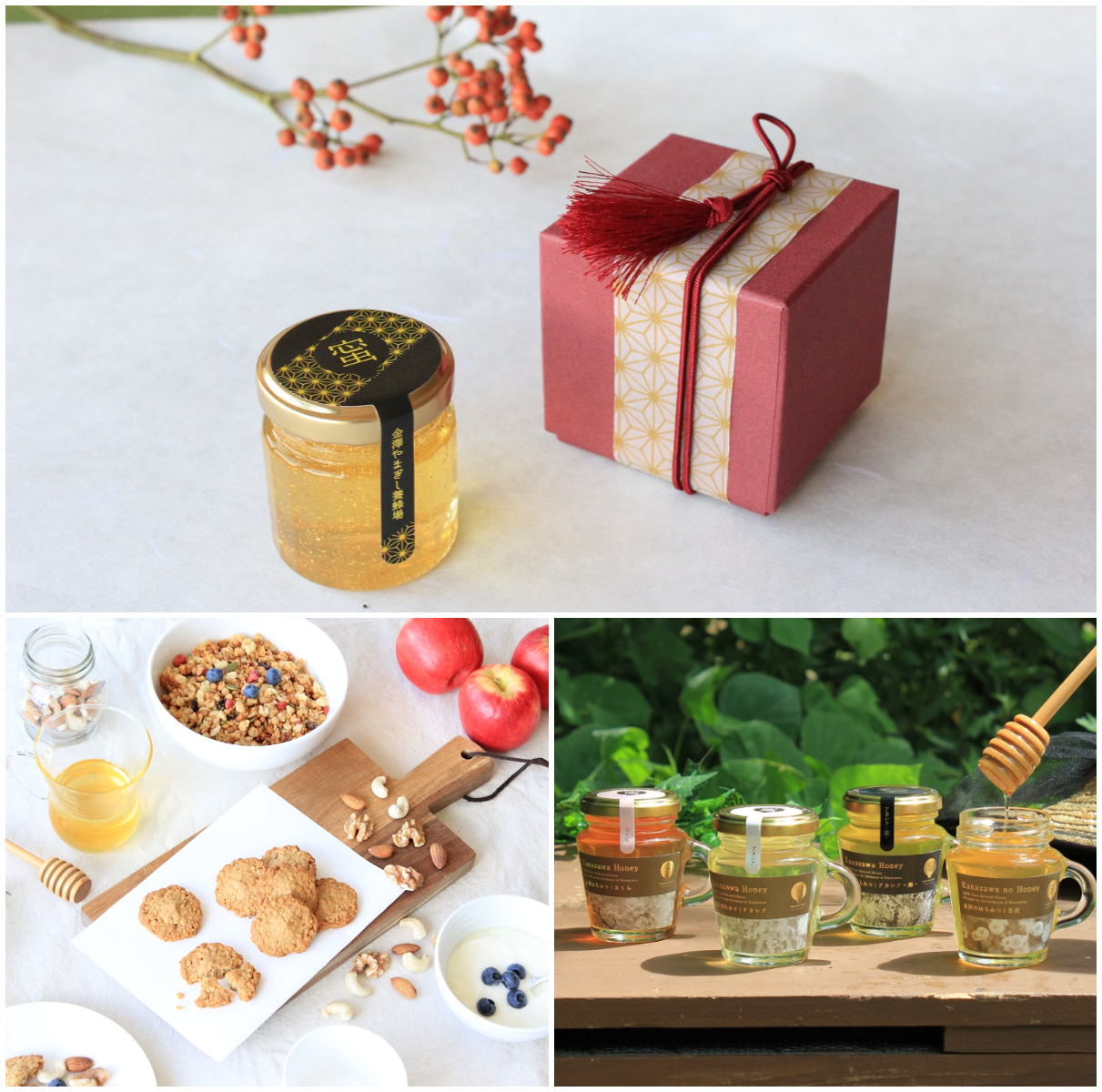 - ●写真上〔金箔入り金澤はちみつ〕50ℊ1,800円(税込)金澤伝統箔を伝承する『箔座』の金箔を金沢の養蜂場で採れたはちみつの中にあしらったもの。淡い色のはちみつに黄金色の金箔がきらめく雅な逸品。贈り物やお祝いや、年賀にもおすすめ。●写真右下〔金澤はちみつ‐四季-プレミアムセット〕【限定50セット】 6,500円 (税込)※12月17日(木)まで 金澤の四季折々の花の蜜がセットになったプレミアムはちみつ。内容は、「さくら」、「アカシア」、「アカシア‐雅-」、「百花」の4種で、芳醇な花の香りを含んだ濃厚な甘みが楽しめる。ほろ苦さを感じるものや甘みにも各々特徴があり、蜂蜜を通して、四季の移ろいを感じることができる。ギフトでも人気のセット。この他「そば」や「みかん」、「れんげ」のシリーズもある。他多数