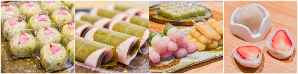 ■左から/桜よもぎ饅頭[4月1日~4月中旬頃]、桜餅(こし餡)[2月17日~4月中旬頃]、花見団子[3月7日~4月中旬頃]みたらし団子、いちご大福(みるく餡)※2個入1日50箱限定[4月下旬頃]