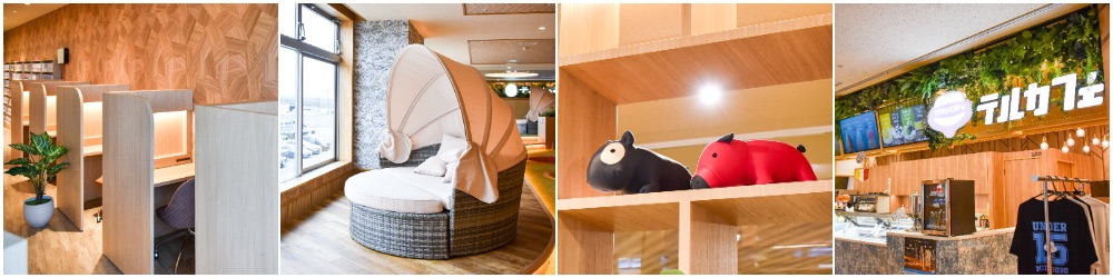 無料のWi-Fiや電源200か所を完備し、TV付きリクライナー全103台が設置されている。リクライナーは男女共有68台、女性専用35台と、だれでも安心して利用できる体制が整っている。読書好きにはたまらない、北陸最大のコミック・雑誌15,000冊を揃えたライブラリも魅力のひとつ。さらに、半個室の席から、カウンター席、テーブル席など、総席数300の広々としたスペースでコワーキングも可能。ペアシートやYogibo、鳥籠、シングルソファなど、多様なレストエリアが用意されており、自分らしい過ごし方を見つけることができる。同館2階には『テルカフェ』、3階には『ゲームコーナー&キッズコーナー』など、幅広い年代が楽しめること間違いなし。
