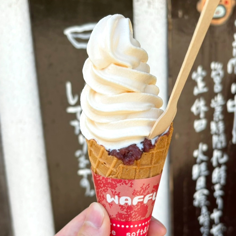 白山比咩神社・北参道の中にある老舗甘味処の看板メニュー。クリームチーズを贅沢に練り込んだソフトクリームは、コク深いまろやかさと後味のさっぱり感を同時に楽しめる逸品。手作りのつぶあんが優しい甘さをプラスし、最後の一口まで飽きさせません。これからの暑い季節にぴったりの、地元で⻑く愛されるやさしい味わいです。