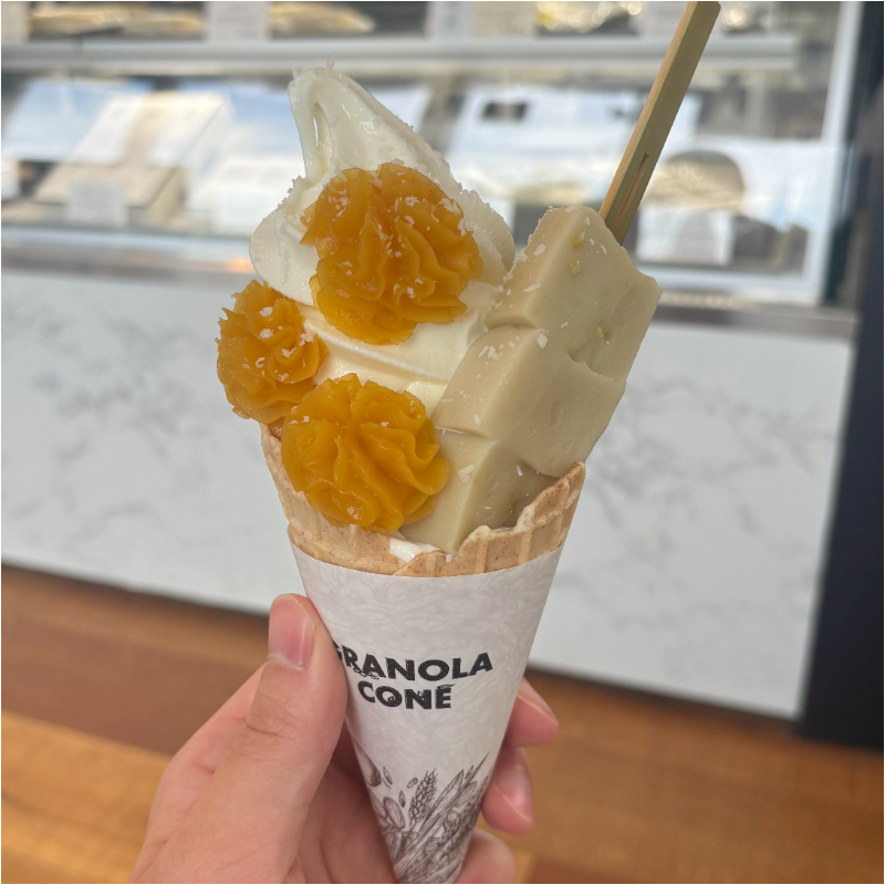 2024年5月のオープン以来、リピーターを生み続ける人気店。金沢の伝統食材「生麸」とソフトクリームが奇跡のコラボレーションを実現しています。生麸のもちもち食感が、北海道から牧場直送の生乳のリッチなミルクのなめらかさと絶妙にマッチ。さらに、つぶあんとグラノーラコーンがアクセントとなり、すべての素材がひとつに溶け合う贅沢な一本です。