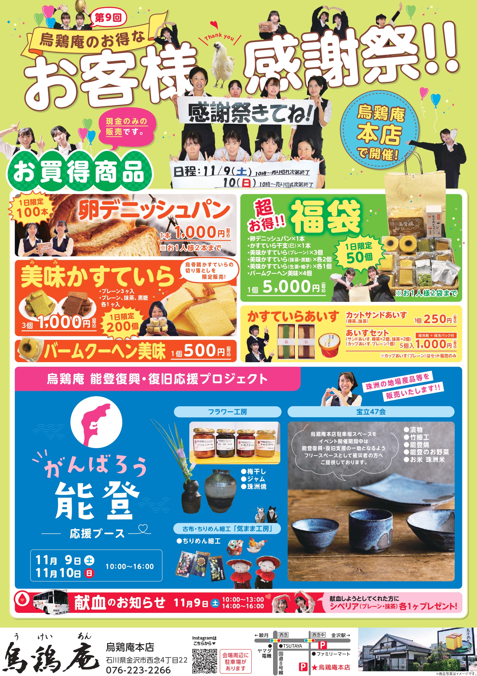 今年は能登復興・復旧応援×感謝祭!【11/9(土)〜10日(日)】『烏鶏庵(うけいあん)』のお得なお客様感謝祭‼️」